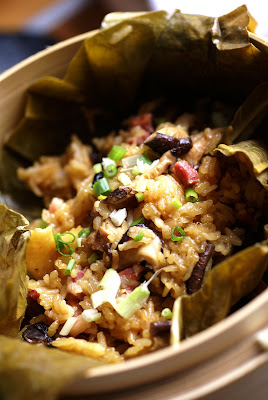 6 然后将荷叶用热水烫软之后,剪成几张正方形,一半一张大荷叶可剪成3-4张正方形或者长方形都可以。然后将4的材料包入荷叶里,压实。上笼蒸20-30分钟即可。